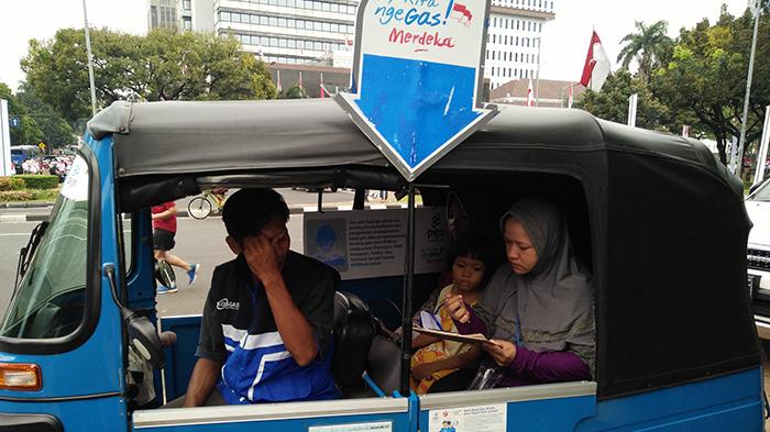 Ket.foto: Salah seorang pengemudi bajaj gratis yang tergabung dalam Komunitas Bajaj Gas (Kobagas) bersama penumpang yang sedang mengisi data diri di IRTI Monas, Jakarta Pusat, Minggu (14/8/2016).