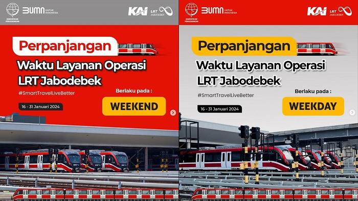 Layanan operasional LRT Jabodebek diperpanjang hingga pukul 22.55 WIB mulai hari ini, Selasa (16/1/2024) dan diterapkan hingga tanggal 31 Januari 2024