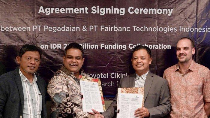 TRIBUNNEWS.COM - PT Pegadaian resmi menjalin kerja sama dengan PT Fairbanc Technologies Indonesia. Kerja sama ini ditandai dengan penandatanganan kesepakatan strategis antara Chief of Transformation Office PT Pegadaian Mulyono dan President Director of Fairbanc Technologies Indonesia, Mir Haque tentang penggunaan jasa layanan ERP platform Digital Fairbanc untuk rekomendasi sebagai calon nasabah Produk Pinjaman Modal Produktif yang dilakukan, pada Jumat (01/03/2024).