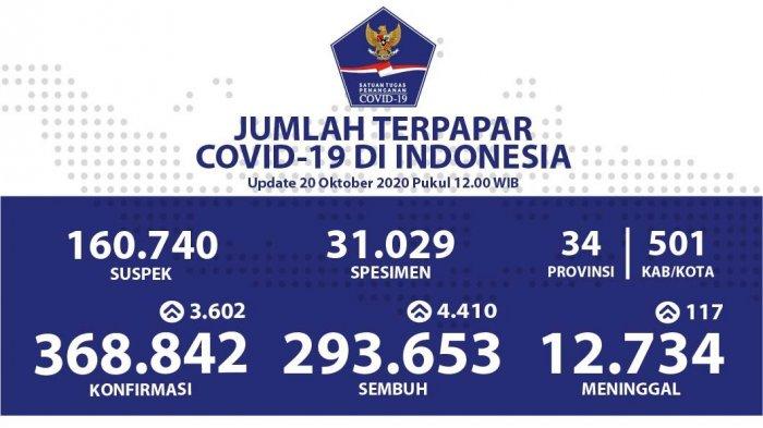 TRIBUNNEWS.COM - Gugus Tugas Percepatan Penanganan Covid-19 melaporkan angka penambahan kasus terkonfirmasi positif per Selasa (20/10/2020).