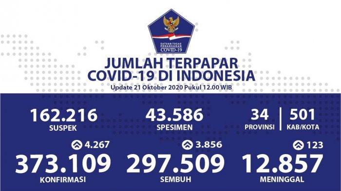 TRIBUNNEWS.COM - Gugus Tugas Percepatan Penanganan Covid-19 melaporkan angka penambahan kasus terkonfirmasi positif per Rabu (21/10/2020).
