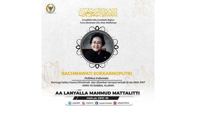 "Duka cita yang mendalam saya sampaikan kepada keluarga besar mantan Presiden Soekarno atas berpulangnya Rachmawati Soekarnoputri. Semoga semua amal ibadahnya diterima Allah SWT, dan keluarga yang ditinggalkan diberikan ketabahan," tutur LaNyalla.