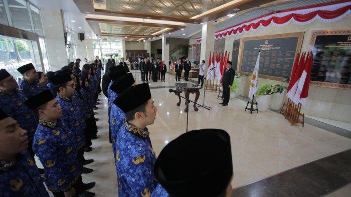 TRIBUNNEWS.COM - Deputi Bidang Administrasi Sekretariat Jenderal DPD RI Lalu Niqman Zahir melantik Pegawai Negeri Sipil (PNS). Sebanyak 46 orang Calon Pegawai Negeri Sipil (CPNS) di lingkungan Setjen DPD RI juga telah diambil sumpah/janjinya.