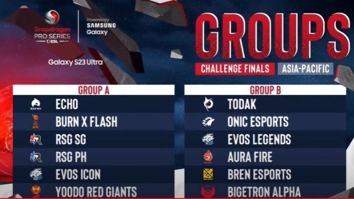 Hasil drawing babak Challange Finals di Snapdragon Pro Series 2023 yang digelar di Jakarta, Indonesia. ONIC, EVOS Legends, Bigetron Alpha satu grup.