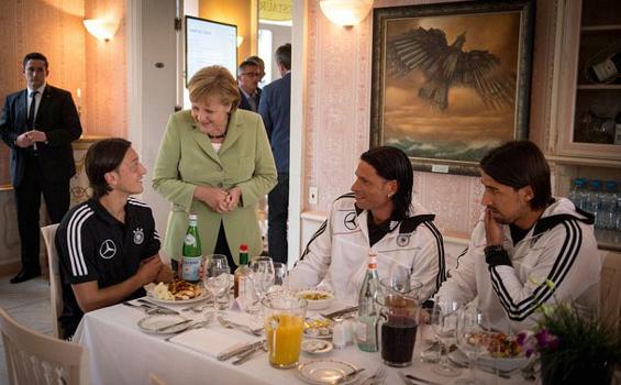 Kanselir Angela Merkel yang mengenakan baju warna hijau sempat berbincang secara personal dengan beberapa pemain saat mereka sedang duduk di meja makan bersama. Mesut Ozil, Tim Wiese, dan Sami Khedira yang duduk satu meja sempat didatangi kanselir. Mereka sempat berbincang tentang persiapan menjelang pertandingan.