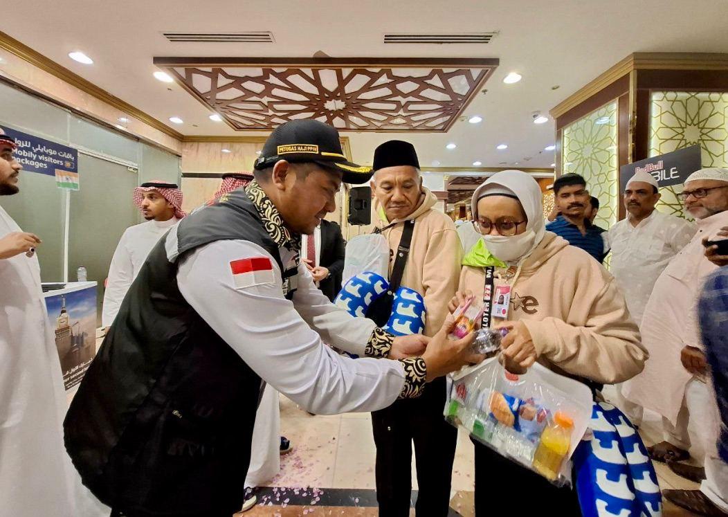 Kepala Daerah Kerja Madinah, Ali Machzumi didamping masyaraik dan pihak hotel menyambut kedatangan 371 jemaah haji kloter 27 embarkasi Surabaya di Hotel Odest AlMadinah, Madinah, Sabtu (18/5/2024) pukul 22.00 WAS.
