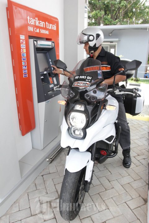 Pengendara melakukan transaksi tarik tunai di mesin ATM Ride Thru Sepeda Motor BNI jalan Ahmad Yani, Kota Semarang, Jateng, Jumat (27/2/2015). BNI Kanwil Semarang saat ini memiliki dua Ride Thru Sepeda Motor untuk mempermudah pengendara sepeda motor dalam penarikan uang. (Tribun Jateng/Wahyu Sulistiyawan)