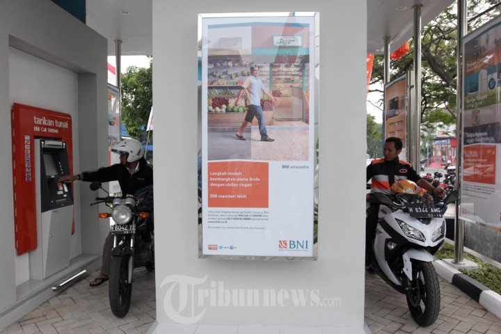 Pengendara melakukan transaksi tarik tunai di mesin ATM Ride Thru Sepeda Motor BNI jalan Ahmad Yani, Kota Semarang, Jateng, Jumat (27/2/2015). BNI Kanwil Semarang saat ini memiliki dua Ride Thru Sepeda Motor untuk mempermudah pengendara sepeda motor dalam penarikan uang. (Tribun Jateng/Wahyu Sulistiyawan)