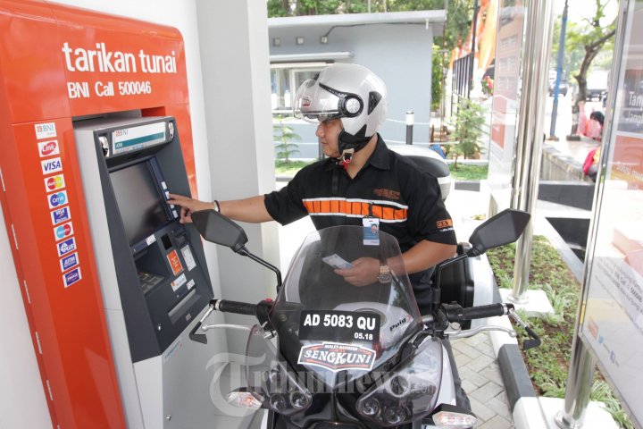 Pengendara melakukan transaksi tarik tunai di mesin ATM Ride Thru Sepeda Motor BNI jalan Ahmad Yani, Kota Semarang, Jateng, Jumat (27/2/2015). BNI Kanwil Semarang saat ini memiliki dua Ride Thru Sepeda Motor untuk mempermudah pengendara sepeda motor dalam penarikan uang. (Tribun Jateng/Wahyu Sulistiyawan)
