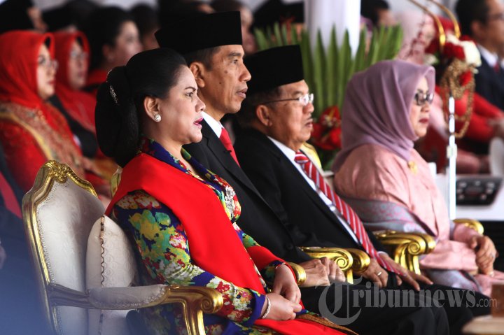 Presiden Joko Widodo beserta istri bersama Wapres Jusuf Kalla beserta istri mengikuti pengibaran bendera peringatan detik-detik proklamasi di Istana Merdeka, Jakarta, Rabu (17/8/2016). Peringatan HUT ke-71 RI kali ini mengambil tema Indonesia Kerja Nyata. TRIBUNNEWS/HERUDIN