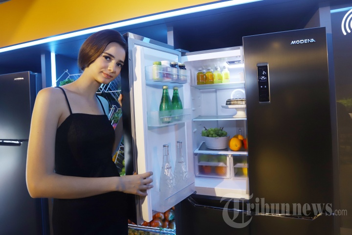 Model berpose di dekat lemari es Modena Smart Sensor Refrigerators, di Jakarta, Kamis (22/8/2019). PT Modena Indonesia mengenalkan lima produk lemari es berteknologi Smart Sensor Refrigerators yang dijual mulai dari Rp 10 juta hingga Rp 20 jutaan. Tribunnews/Herudin