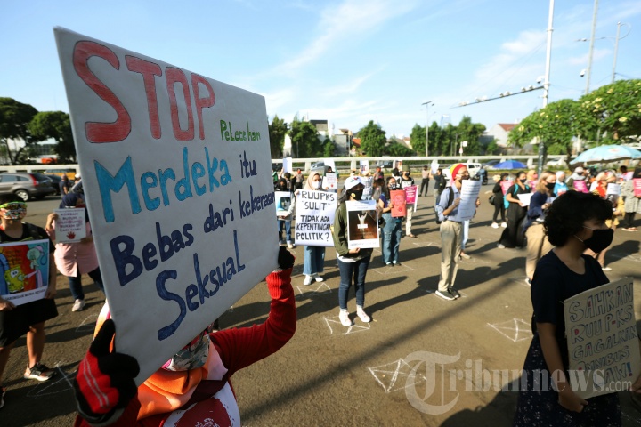 Puluhan wanita saat menggelar aksi unjuk rasa mengenai rancangan undang-undang penghapusan kekerasan seksual (RUU PKS) di depan gedung DPR, Jakarta Pusat, Selasa (7/7/2020). Pada aksi tersebut mereka meminta untuk segera mengesahkan RUU PKS. Tribunnews/Jeprima
