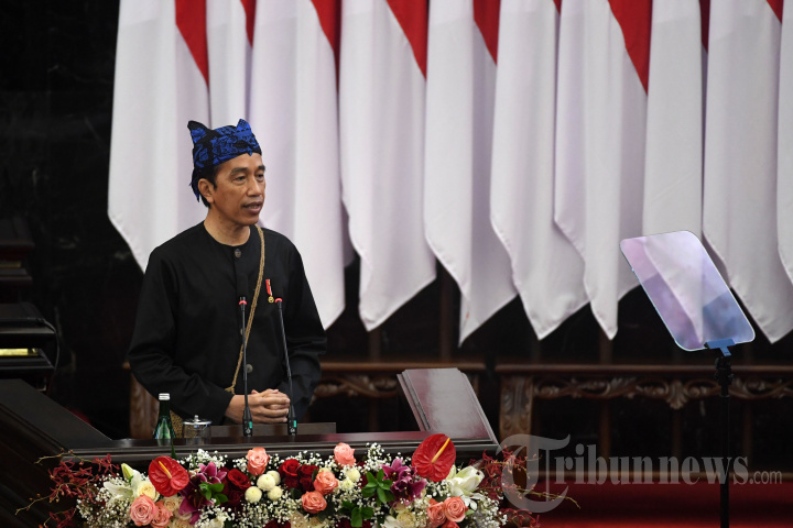 Presiden Joko Widodo menyampaikan pidato kenegaraan dalam Sidang Tahunan MPR RI dan Sidang Bersama DPR RI dan DPD RI, di Kompleks Parlemen, Senayan, Jakarta Pusat, Senin (16/8/2021). Pidato Presiden Jokowi tersebut sekaligus dalam rangka HUT Ke-76 Kemerdekaan Republik Indonesia. Pada kesempatan itu, Presiden Jokowi mengenakan busana adat dari suku Baduy, Banten. Tribunnews/HO/Biro Pers Setpres/Lukas