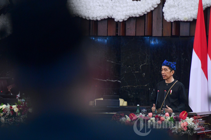 Presiden Joko Widodo menyampaikan pidato kenegaraan dalam Sidang Tahunan MPR RI dan Sidang Bersama DPR RI dan DPD RI, di Kompleks Parlemen, Senayan, Jakarta Pusat, Senin (16/8/2021). Pidato Presiden Jokowi tersebut sekaligus dalam rangka HUT Ke-76 Kemerdekaan Republik Indonesia. Pada kesempatan itu, Presiden Jokowi mengenakan busana adat dari suku Baduy, Banten. Tribunnews/HO/Biro Pers Setpres/Muchlis Jr