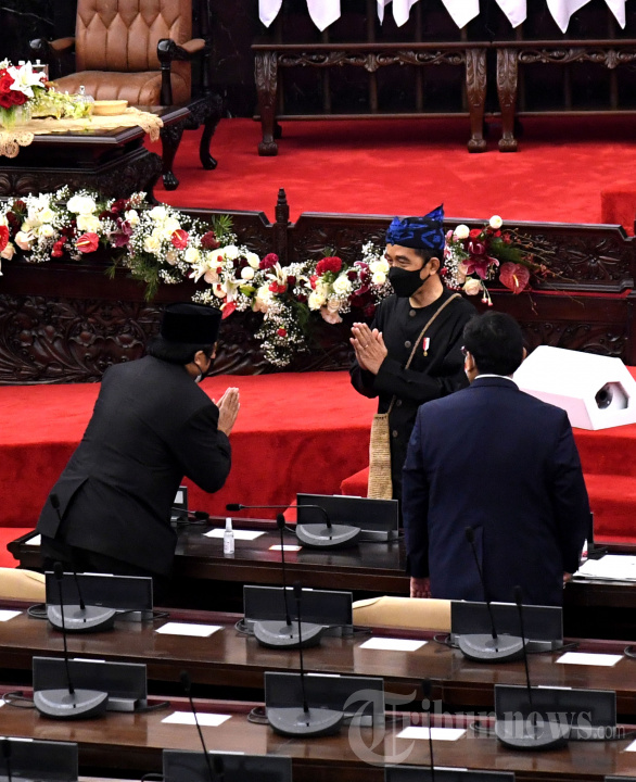 Presiden Joko Widodo memberikan salam kepada Anggota MPR/DPR/DPD RI saat berpamitan usai menyampaikan pidato kenegaraan dalam Sidang Tahunan MPR RI dan Sidang Bersama DPR RI dan DPD RI, di Kompleks Parlemen, Senayan, Jakarta Pusat, Senin (16/8/2021). Pidato Presiden Jokowi tersebut sekaligus dalam rangka HUT Ke-76 Kemerdekaan Republik Indonesia. Pada kesempatan itu, Presiden Jokowi mengenakan busana adat dari suku Baduy, Banten. Tribunnews/HO/Biro Pers Setpres/Lukas