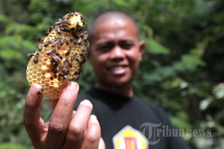 Petani menunjukkan sarang madu yang dihasilkan lebah madu (Apis Cerana) saat panen di Penangkaran Lebah Madu Takoma, Simalungun, Sumatera Utara, Minggu (12/12/2021). Penangkaran lebah madu Takoma yang juga berkonsep edukasi wisata tersebut memasarkan madu dengan harga Rp 200 ribu per kilogram. TRIBUNNEWS/IRWAN RISMAWAN