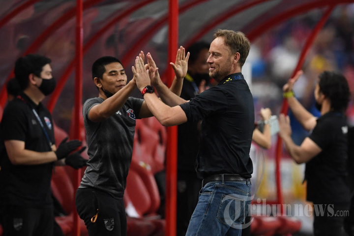 Pelatih kepala Timnas Thailand Alexandre Polking (kedua dari kanan) merayakan kemenangan bersama timnya setelah memenangkan leg pertama pertandingan final sepak bola Piala AFF Suzuki 2020 melawan Indonesia di Stadion Nasional Singapura. Rabu (29/12/2021). (Roslan RAHMAN / AFP)