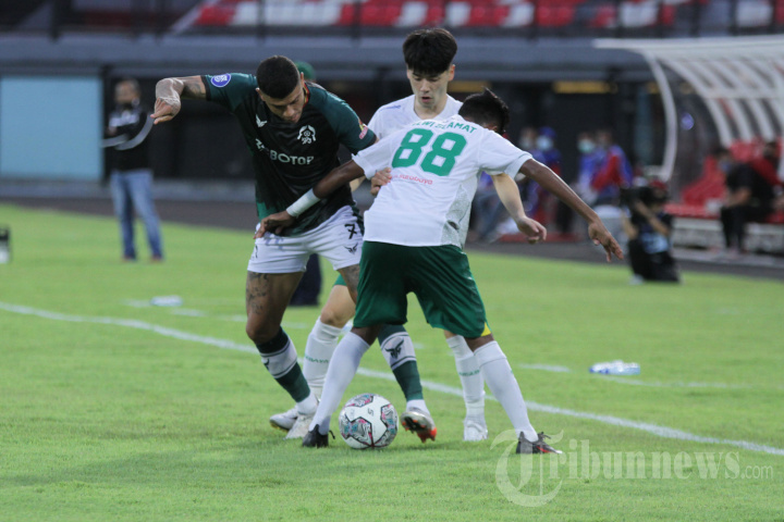 Pesepak bola Persebaya Surabaya, Alwi Slamat (kanan depan) berduel memperebutkan bola dengan pesepak bola Persikabo 1973, Ciro Alves (kiri) pada pekan 18 BRI Liga 1 2021-2022 di Stadion Kapten I Wayan Dipta, Gianyar, Bali, Senin (10/1/2022) malam. Persebaya Surabaya menang dengan skor 3-2 atas Persikabo 1973. TRIBUNNEWS/MUHAMMAD NURSINA