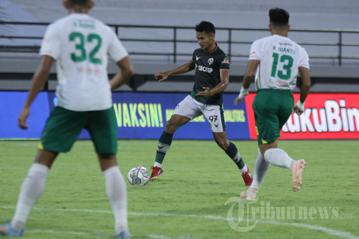 Pesepak bola Persikabo 1973, Muhammad Dimas Drajat (tengah) menggocek bola dan diadang pesepak bola Persebaya Surabaya, Rahmat Irianto (kanan) dan Rizky Ridho (kiri) pada pekan 18 BRI Liga 1 2021-2022 di Stadion Kapten I Wayan Dipta, Gianyar, Bali, Senin (10/1/2022) malam. Persebaya Surabaya menang dengan skor 3-2 atas Persikabo 1973. TRIBUNNEWS/MUHAMMAD NURSINA
