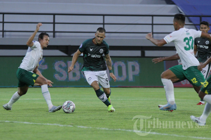 Pesepak bola Persikabo 1973, Aleksandar Rakic (kedua kiri) melewati adangan pesepak bola Persebaya Surabaya, Arif Satria (kiri) pada pekan 18 BRI Liga 1 2021-2022 di Stadion Kapten I Wayan Dipta, Gianyar, Bali, Senin (10/1/2022) malam. Persebaya Surabaya menang dengan skor 3-2 atas Persikabo 1973. TRIBUNNEWS/MUHAMMAD NURSINA