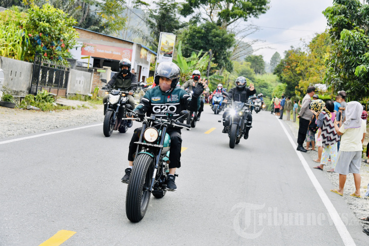 Presiden Joko Widodo dan rombongan mengendarai sepeda motor saat kunjungan kerja (kunker) ke Provinsi Sumatera Utara, Rabu (2/2/2022). Presiden Jokowi menunggangi Kawasaki W175 custom dari Simpang Sibisa, Kabupaten Toba, menuju Kawasan Pantai Bebas Parapat, Kabupaten Simalungun, sejauh 11 kilometer. Tribunnews/HO/Biro Pers Setpres/Laily Rachev