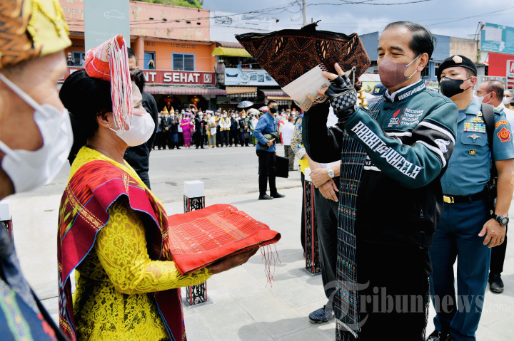 Presiden Joko Widodo menerima dan mengenakan Hio/Suri-Suri yang diselempangkan pada pundak kanannya dan Gotong yang dikenakan sebagai penutup kepala saat meninjau sekaligus meresmikan penataan Kawasan Pantai Bebas Parapat di Kabupaten Simalungun, Sumatera Utara, Rabu (2/2/2022). Kehadiran Presiden Jokowi adalah untuk melihat revitalisasi dan perbaikan-perbaikan fasilitas guna mendukung salah satu destinasi wisata kawasan Danau Toba tersebut. Turut mendampingi Jokowi dalam peninjauan antara lain Menko Bidang Kemaritiman dan Investasi, Luhut Binsar Pandjaitan, Menteri Pekerjaan Umum dan Perumahan Rakyat (PUPR), Basuki Hadimuljono, Menteri Pariwisata dan Ekonomi Kreatif, Sandiaga Uno, Gubernur Sumatera Utara, Edy Rahmayadi, dan Bupati Simalungun, Radiapoh Hasiholan Sinaga. Tribunnews/HO/Biro Pers Setpres/Laily Rachev