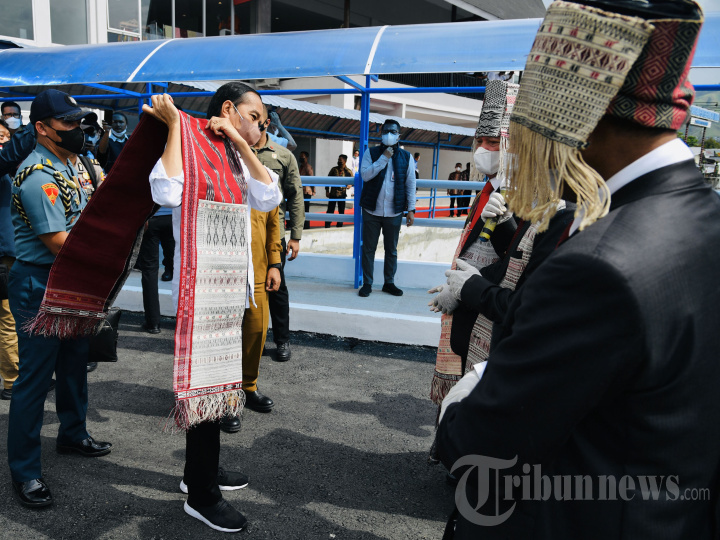 Presiden Joko Widodo disambut prosesi adat Batak sebelum menaiki kapal feri saat hendak menyeberang dari Pelabuhan Ajibata, Kabupaten Toba, ke Pelabuhan Ambarita, Kabupaten Samosir, dalam kunjungan kerjanya di Provinsi Sumatera Utara, Rabu (2/2/2022). Presiden Jokowi diberikan kain ulos yang bernama Ulos Pinussaan yang diselempangkan di pundak kanan. Setelah kain ulos diberikan, prosesi adat dilanjutkan dengan penaburan beras. Lalu dirangkai lagi dengan pemercikan air suci dari cawan dengan daun beringin. Jokowi juga tampak menjatuhkan jeruk purut ke Danau Toba. Tribunnews/HO/Biro Pers Setpres/Laily Rachev