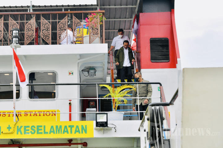 Presiden Joko Widodo dan rombongan tiba di dermaga Pelabuhan Ambarita, Kabupaten Samosir, usai menyeberangi Danau Toba dengan menaiki kapal feri KMP Kaldera Toba yang berangkat dari Pelabuhan Ajibata, Kabupaten Toba, Sumatera Utara, Rabu (2/2/2022). Sebelumnya, Presiden Jokowi meresmikan tujuh pelabuhan penyeberangan dan empat kapal motor penumpang (KMP) di kawasan dermaga Pelabuhan Ajibata. Di antara yang diresmikan itu adalah Pelabuhan Ajibata dan KMP Kaldera Toba. Tribunnews/HO/Biro Pers Setpres/Laily Rachev