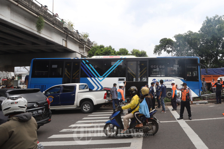 Sejumlah petugas berusaha mengevakuasi bus TransJakarta koridor 11 Kampung Melayu-Pulo Gebang yang mengalami kecelakaan di kawasan I Gusti Ngurah Rai, Jakarta Timur, Jumat (11/2/2022). Kecelakaan tersebut diduga akibat sopir hilang konsentrasi sehingga menambrak pembatas jalan dan rambu lalu lintas yang mengakibatkan bodi depan bus ringsek namun tidak menimbulkan korban jiwa. Tribunnews/Jeprima
