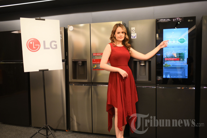 Model berpose disamping kulkas InstaView dan Side by Side LG saat sesi foto pengenalan produk di Jakarta, Selasa (8/3/2022). Kulkas InstaView dan Side by Side LG menawarkan keindahan desain dan peningkatan kenyamanan penggunaan melengkapi koleksi kulkas berkapasitas diatas 600 Liter LG Indonesia di tahun 2022. Terdapat tiga pilihan kulkas LG InstaView yang bakal diperkenalkan LG di tahun ini. tribunnews/HO
