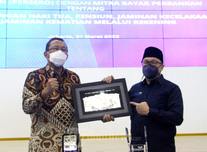 TRIBUNNEWS.COM, JAKARTA - Direktur Utama PT Bank Tabungan Negara (Persero) Tbk. Haru Koesmahargyo bersama Direktur Utama PT Taspen (Persero) A.N.S. Kosasih menunjukkan naskah Perjanjian Kerjasama (PKS) perihal Pembayaran Tabungan Hari Tua, Pensiun, Jaminan Kecelakaan Kerja, dan Jaminan Kematian Melalui Rekening di Jakarta, Kamis (31/3/2022). Melalui kerjasama tersebut, Bank BTN kembali dipercaya menjadi bank untuk pembayaran berbagai dana Taspen kepada para peserta Taspen. Adapun, Bank BTN telah menjadi bank mitra Taspen sejak 2014. Bank BTN pun terus berinovasi untuk menghadirkan layanan yang mendukung digitalisasi Taspen, salah satunya melalui BTN Taspen Smart Card. //ist/xis