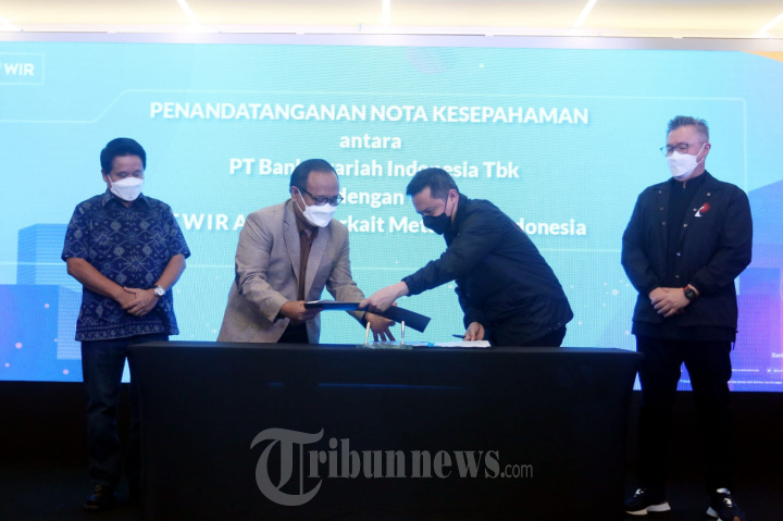 TRIBUNNEWS.COM, JAKARTA - PT Bank Syariah Indonesia Tbk (BSI) dan PT WIR Asia Tbk (WIR Group) menjajaki kerjasama pengembangan layanan metaverse kanal realitas virtual yang dituangkan dalam penandatangan nota kesepahaman dan disaksikan oleh Direktur Utama BSI Hery Gunardi (kiri) beserta Executive Chairman and Co Founder WIR Group Daniel Surya (kanan) Penandatanganan dilakukan oleh Direktur Information Technology BSI Achmad Syafii (dua dari kiri) & Direktur Utama WIR Group Michel Budi (tiga dari kiri), Selasa (26/4/2022) //IST/HO