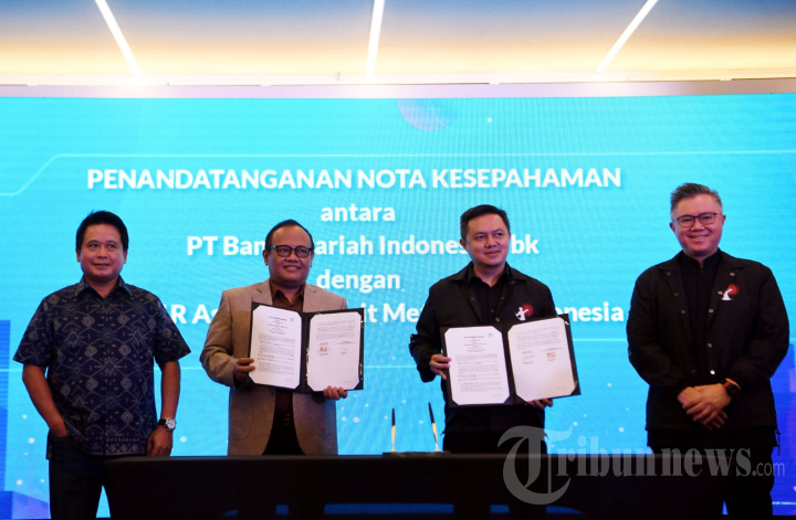 TRIBUNNEWS.COM, JAKARTA - PT Bank Syariah Indonesia Tbk (BSI) dan PT WIR Asia Tbk (WIR Group) menjajaki kerjasama pengembangan layanan metaverse kanal realitas virtual yang dituangkan dalam penandatangan nota kesepahaman dan disaksikan oleh Direktur Utama BSI Hery Gunardi (kiri) beserta Executive Chairman and Co Founder WIR Group Daniel Surya (kanan)