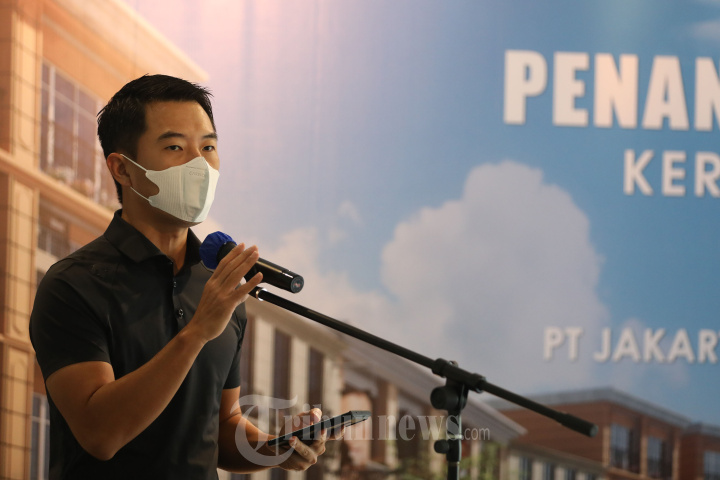 Presiden Direktur Mitra10 Andy Totong memberikan kata sambutan pada acara penandatanganan kerjasama antara Mitra10 dengan Vasanta Ecotown di Tangerang, Banten, Senin (13/6/2022). Ritel modern bahan bangunan & home improvement yang berada dibawah naungan PT Catur Sentosa Adiprana Tbk. Kini akan membuka gerai flagship store kedua di Vasanta Ecotown, Sawangan, Depok. Superstore Mitra10 ini ditargetkan mulai beroperasi di shopping street The Shoppes at Senopati Boulevard, Vasanta Ecotown pada tahun 2023. Tribunnews/Jeprima