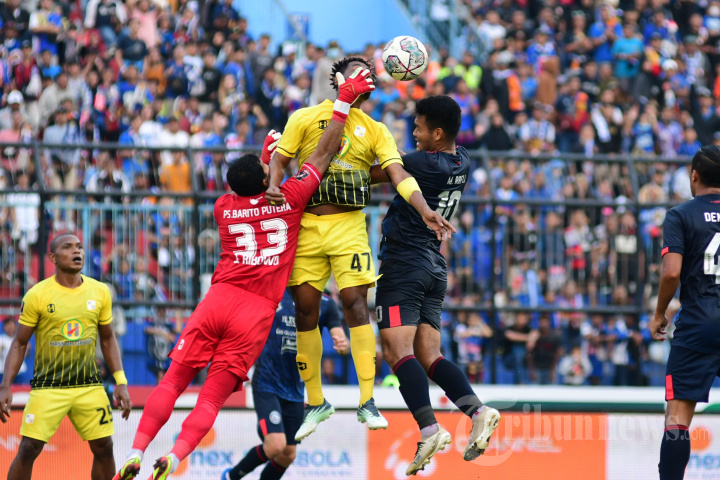 Pemain Arema FC M Rafli berduel udara dengan pemain Barito Putera dalam laga lanjutan Piala Presiden 2022 di Stadion Kanjuruhan, Kabupaten Malang, Sabtu (2/7/2022). Arema FC berhasil lolos semifinal setalah menang adu pinalti melawan Barito Putera dengan skor 5-4. TRIBUN JATIM/PURWANTO