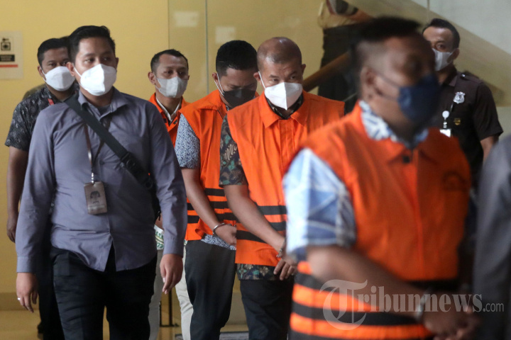 Sejumlah tersangka kasus dugaan korupsi pada Dinas Pekerjaan Umum dan Tata Ruang (PUTR) Pemerintah Provinsi Sulawesi Selatan 2019 - 2020 mengenakan rompi tahanan usai menjalani pemeriksaan di Gedung KPK, Jakarta, Kamis (18/8/2022). KPK menahan Kepala Perwakilan BPK Sulawesi Tenggara / Mantan Kasuauditorat Sulsel I BPK Perwakilan Provinsi Sulawesi Selatan (Sulsel) Andi Sonny, dan 3 orang Pemeriksa pada BPK Perwakilan Provinsi Sulsel yaitu Yohanes Binur Haryanto Manik, Wahid Ikhsan Wahyudin serta Gilang Gumilar terkait kasus dugaan korupsi pada Dinas Pekerjaan Umum dan Tata Ruang (PUTR) Pemerintah Provinsi Sulawesi Selatan 2019 - 2020. TRIBUNNEWS/IRWAN RISMAWAN