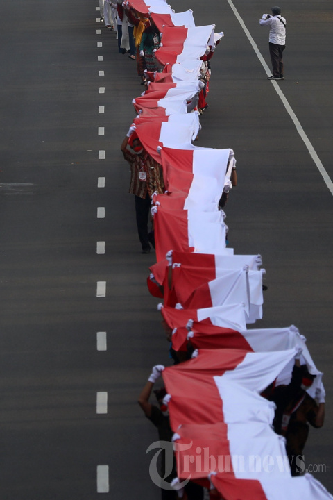 Peserta membentangkan Bendera Merah Putih di Jalan Merdeka Barat, Kawasan Patung Kuda, Jakarta, Minggu (28/8/2022). Sebanyak 50.000 orang membentangkan Bendera Merah Putih sepanjang 1.700 meter dari kawasan Monas hingga Bundaran HI sebagai rangkaian dalam memperingati Hari Kemerdekaan Indonesia dengan tema 'Pulih Lebih Cepat, Bangkit Lebih Kuat dan menggelorakan semangat persatuan kesatuan bangsa menghadapi segala macam tantangan yang ada. TRIBUNNEWS/IRWAN RISMAWAN