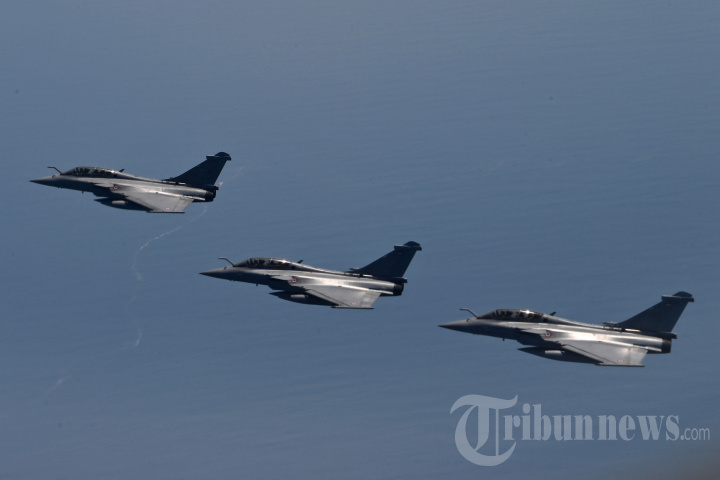 Pesawat tempur multiperan Dassault Rafale terbang dalam formasi selama penerbangan demonstrasi oleh Angkatan Udara Prancis di atas Selat Sunda Indonesia pada 12 September 2022. - Indonesia pada Februari 2022 menandatangani kesepakatan dengan Prancis untuk membeli enam pesawat tempur Rafale sebagai bagian dari pesanan total yang diantisipasi. 42, saat Paris memperkuat hubungan militer di Asia-Pasifik. (Photo by ADEK BERRY / AFP)