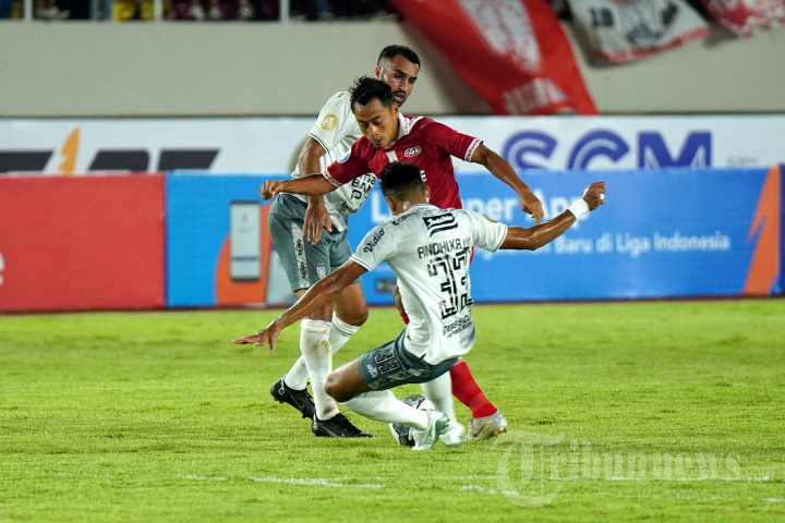 Bek kanan Bali United, Andhika Pradana Wijaya (bawah) melakukan tekel terhadap penyerang tengah Persis Solo, Samsul Arif (tengah) dalam laga pekan ke-10 BRI Liga 1 2022/2023 antara Persis Solo kontra Bali United di Stadion Manahan, Kota Solo, Jawa Tengah, Kamis (15/9/2022) malam. Persis Solo berhasil menaklukkan Bali United dengan skor 2-0 (1-0). Kedua gol dicetak oleh Ryo Matsumura. TRIBUNNEWS/MUHAMMAD NURSINA