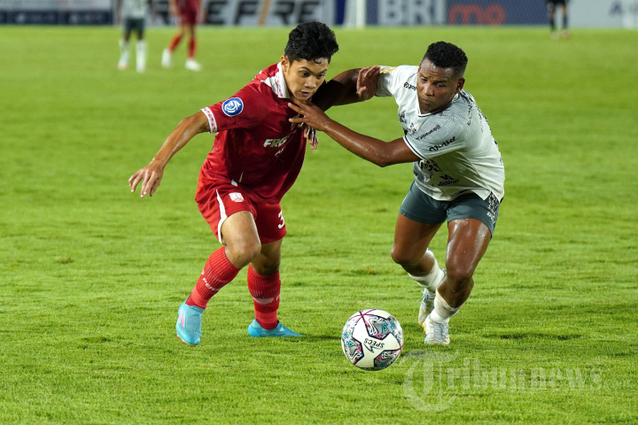 Penyerang sayap kanan Persis Solo, Althaf Indie Alrizky (kiri) berebut bola dengan gelandang serang Bali United, Eber Bessa dalam laga pekan ke-10 BRI Liga 1 2022/2023 antara Persis Solo kontra Bali United di Stadion Manahan, Kota Solo, Jawa Tengah, Kamis (15/9/2022) malam. Persis Solo berhasil menaklukkan Bali United dengan skor 2-0 (1-0). Kedua gol dicetak oleh Ryo Matsumura. TRIBUNNEWS/MUHAMMAD NURSINA