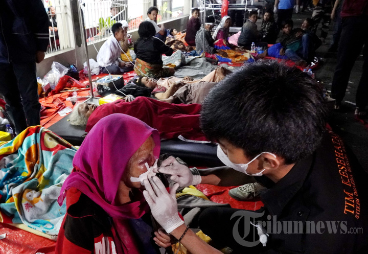 Korban luka akibat gempa bumi menjalani perawatan di halaman Rumah Sakit Umum Daerah (RSUD) Sayang, Jalan Rumah Sakit, Kabupaten Cianjur, Jawa Barat, Senin (21/11/2022). Akibat gempa bumi berkekuatan 5,6 magnitudo yang berpusat di kawasan Kabupaten Cianjur sekitar pukul 13.21 WIB, hingga pukul 21.00 korban meninggal dunia sebanyak 162 jiwa, 326 luka berat dan ringan, 2.345 rumah rusak dan sekitar 13.400 jiwa mengungsi. TRIBUN JABAR/GANI KURNIAWAN