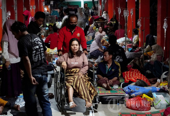 Korban luka akibat gempa bumi menjalani perawatan di halaman Rumah Sakit Umum Daerah (RSUD) Sayang, Jalan Rumah Sakit, Kabupaten Cianjur, Jawa Barat, Senin (21/11/2022). Akibat gempa bumi berkekuatan 5,6 magnitudo yang berpusat di kawasan Kabupaten Cianjur sekitar pukul 13.21 WIB, hingga pukul 21.00 korban meninggal dunia sebanyak 162 jiwa, 326 luka berat dan ringan, 2.345 rumah rusak dan sekitar 13.400 jiwa mengungsi. TRIBUN JABAR/GANI KURNIAWAN