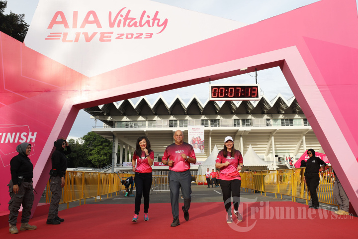 Presiden Direktur AIA, Sainthan Satyamoorthy (tengah) bersama Chief Marketing Officer AIA, Kathryn Parapak (kanan) usai flag-off 5K run and walk di acara AIA Vitality Live 2023 di Istora Senayan, Gelora Bung Karno (GBK), Jakarta, Minggu (8/1/2023). AIA Vitality Live 2023 merupakan acara olahraga dan hiburan pertama yang diadakan oleh perusahaan asuransi terdepan dan tepercaya AIA tahun ini yang diikutii 4.000 orang terdiri dari nasabah, karyawan, tenaga pemasar, dan publik. TRIBUNNEWS/IRWAN RISMAWAN