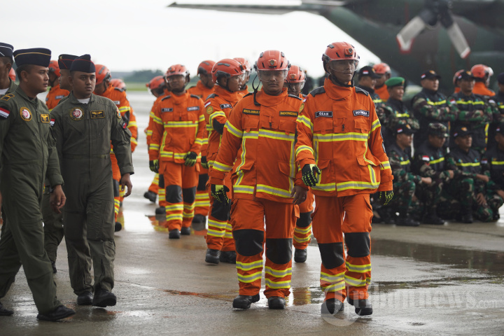 Personel Basarnas bersiap memasuki pesawat boeing 737 TNI AU untuk mengikuti misi kemanusian ke Turki di Lanud Halim Perdanakusuma, Jakarta, Sabtu (11/2/2023). Pemerintah mengirimkan bantuan logistik sebanyak lima ton dan personel gabungan tim pencarian dan penyelamatan (SAR) sebanyak 65 orang untuk membantu proses operasi SAR korban gempa di Turki. TRIBUNNEWS/HERUDIN