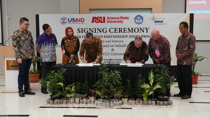 (ASU) dan turut hadir menyaksikan diantaranya, Tatum Syarifah Adiningrum, Ph.D. (Academic Development Senior Manager BINUS UNIVERSITY), Mr. Jeff Cohen, (USAID Mission Director) dan Mr. Abdul Rahman, (USAID HEPI Country Director).