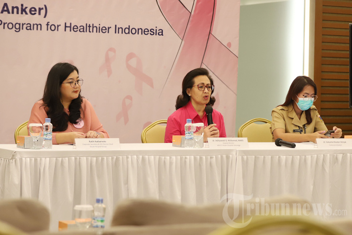 Corporate Secretary & ESG Division Head Siloam Hospital Group, Ratih Hadiwinoto (kiri) bersama Direktur MRCCC Siloam, dr Adityawati Ganggaiswari M Biomed MARS (tengah), serta perwakilan Onkologi, dr Sukyama Rosalyn Sitinjak menggelar konferensi pers rangkaian program Selangkah (SEmangat LAwan KAnker) di sepanjang tahun 2023 di Gedung MRCCC Siloam Semanggi, Jakarta Selatan, Selasa (7/3/2023). Sebagai perwujudan komitmen pelayanan kepada masyarakat secara berkelanjutan, khususnya penanganan kanker di Indonesia, Siloam Hospitals Group akan mengadakan program skrining kanker payudara secara gratis untuk 25.000 wanita di seluruh Indonesia. Menargetkan wanita usia 35 tahun ke atas, program ini juga akan tersedia bagi kalangan perempuan dengan keterbatasan akses kesehatan. TRIBUNNEWS/JEPRIMA