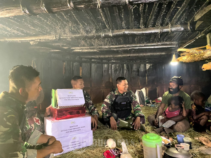 TRIBUBUNNEWS.COM - Kegiatan anjangsana oleh personel Pos Malagayneri Satgas Yonif Mekanis 203/AK kali ini memiliki cerita indah bagi keluarga Bapak Mekison Kogoya yang juga sebagai Majelis Gereja Lowanom di Desa Lowanom, Distrik Malagayneri, Kabupaten Lanny Jaya, Senin (13/03/2023). Kegiatan anjangsana yang dipimpin oleh Danpos Malagayneri Letda Inf Sukamto ini memiliki tujuan khusus dengan mengunjungi keluarga Bapak Mekison Kogoya yang sedang berbahagia. Kedatangan personel Pos Malagayneri ke rumahnya di sambut hangat dan baik oleh beliau. Selain melaksanakan silaturahmi, personel Pos Malagayneri pun memberikan kado dan bingkisan untuk anaknya yang baru lahir serta keluarga Bapak Mekison Kogoya. //PUSPEN TNI