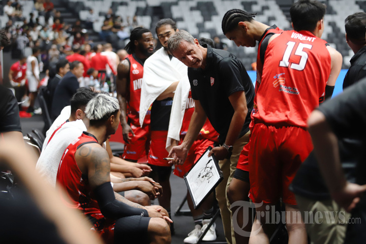 Pelatih Timnas Basket Indonesia, Milos Pejic (empat kanan) memberikan instruksi kepada pemainnya saat melawan Timnas UEA pada pertandingan Indonesia International Basketball Invitational (IIBI) di Indonesia Arena, Jakarta, Jumat (4/8/2023). Timnas Indonesia menang atas Timnas UAE dengan skor 66 - 59. TRIBUNNEWS/HERUDIN