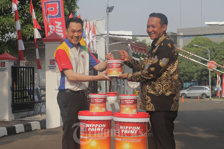 General Manager TU Division Nippon Paint Indonesia Mark Liew menyerahkan secara simbolis cat kepada Kepala Bagian Umum Sekretariat Direktorat Jenderal Bina Pemerintahan Desa Kementerian Dalam Negeri Simon Makarios Aruan untuk pengecatan gapura merah putih dalam program CSR Warnai Kehidupan #ColouringLives di Jakarta, Sabtu (12/8/2023). Lewat program CSR Warnai Kehidupan #ColouringLives pengecatan Gapura Merah Putih juga selaras dengan 5 dari 17 tujuan pembangunan berkelanjutan PBB, yakni kehidupan sehat dan sejahtera, pendidikan berkualitas, pekerjaan layak dan pertumbuhan ekonomi, mengurangi kesenjangan, kota dan permukiman ramah lingkungan. Nippon Paint telah mendonasikan 243.490 liter cat untuk 24.349 gapura di seluruh Indonesia menggunakan produk Nippon Weatherbond Solareflect dengan kode warna Merah Merdeka 1945 dan Brilliant White 1001/ Putih Bersih yang diformulasikan khusus oleh tim Nippon Paint dengan kode pantone standar internasional bendera Indonesia. Tribunnews/Jeprima