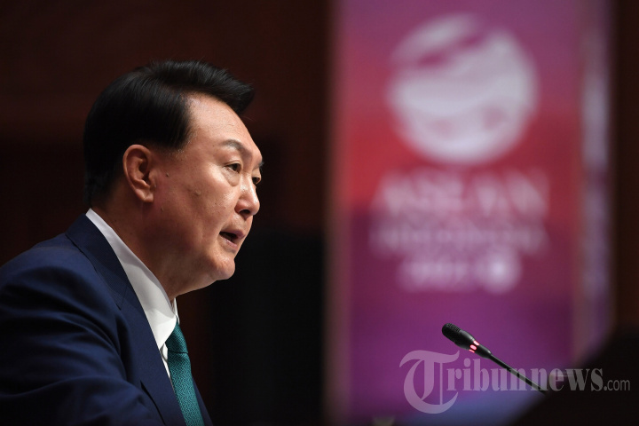 Presiden Republik Korea Yoon Suk Yeol saat menghadiri KTT Ke-24 ASEAN-Republik Korea di Jakarta, Rabu (6/9/2023). Pertemuan ini merupakan serangkaian dari agenda KTT Ke-43 ASEAN yang digelar di Jakarta Convention Center sejak 5 September hingga 7 September 2023 mendatang. Media Center of ASEAN Summit 2023/Akbar Nugroho Gumay/foc/ratih.